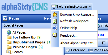 The Header Area is the space at the top of the Content Manager where the Alpha Sixty logo and Logout button are located. In addition, there is a dropdown menu which provides some additional features described here.