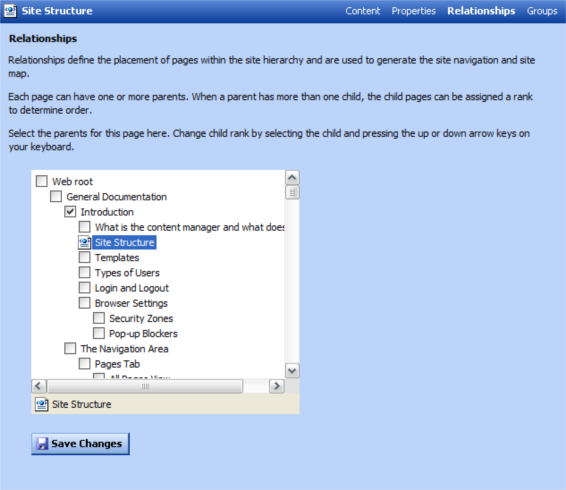 The Relationships Screen provides the opportunity to change the hierarchical relationships of pages. These changes will affect the actual navigation of the site and the order of navigation items, also referred to as rank.