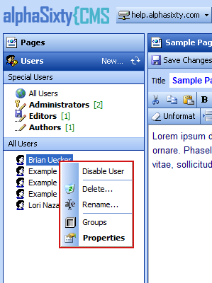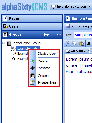 Right-clicking on a group displays a context menu showing the actions allowed to be performed on that group. The user account context menu is also available by right-clicking on one of the group's members.