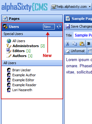 When the Users Tab is active, a New... link appears in the tab heading. This link allows Administrators to create a new user account.