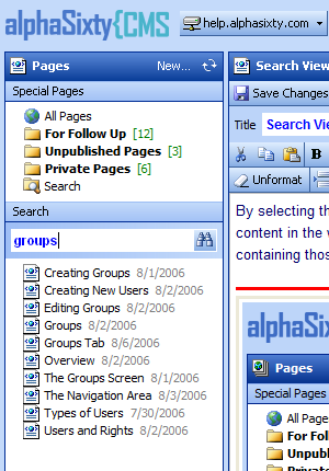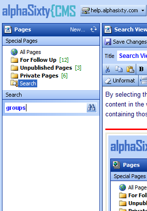 This displays all pages that are marked 'private'. Private pages are kept hidden from view by the general public (even if they contain published content). Making a page private allows you to make changes without worrying that visitors to the website will see the page in progress. By selecting the Search view, a search field appears. You can type in words to help locate specific content in the website. By typing a word or words and hitting the search button, a list of pages containing those words will appear below.