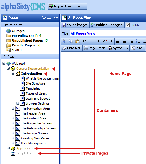 Private pages appear as gray text and the home page is marked with a special icon. Containers are shown using a special icon and gold text.