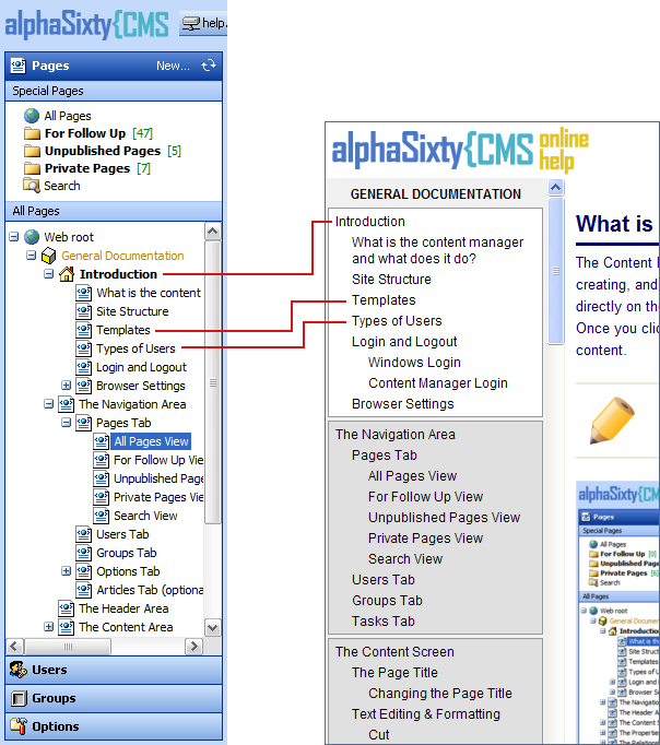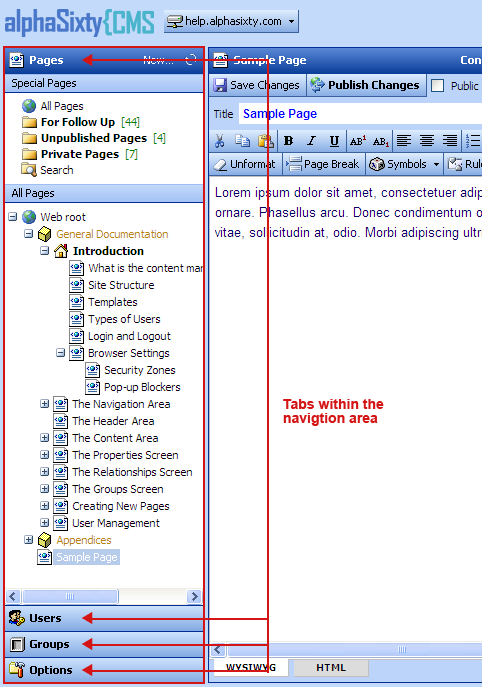 IntroductionWhat is the content manager and what does it do?Site StructureTemplatesTypes of UsersLogin and LogoutBrowser SettingsSecurity ZonesPop-up Blockers The Navigation AreaPages TabAll Pages ViewFor Follow Up ViewUnpublished Pages ViewPrivate Pages ViewSearch ViewUsers TabGroups TabOptions TabAdvanced OptionsOrganizationTroubleshootingArticles Tab (optional) The Content AreaThe Page TitleChanging the Page TitleText Editing & FormattingCutCopyPasteBoldItalicUnderlineSuperscript & SubscriptLeft, Center, Right AlignmentNumbered ListBulleted ListIndent & OutdentColorUnformatPage BreakSymbolsRulerSaving ChangesUndo Last SavePublishing/Submitting ChangesPublic CheckboxManaging ImagesUploading New ImagesImage Sizing OptionsResizingPlacing ImagesAligning ImagesImage CaptionsImage BordersEdit ImagesLinking ImagesRemoving ImagesManaging StylesStyle TypesCreating New StylesApplying StylesManaging FilesUploading New FilesLinking FilesManaging LinksTypes of LinksAutomatic LinksLink Type Dropdown MenuPage LinksImage LinksFile LinksExternal LinksEmail LinksLinks to an ImageClearing LinksManaging VersionsNewEditDeletePreviewWYSIWYG & HTML ViewsPage NotesThe Control Tray |