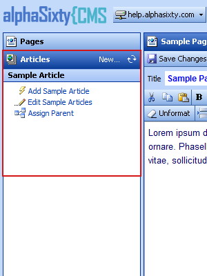 Toggle Temp Pane This toggles a hidden frame that provides additional messages to help troubleshoot CMS problems. The Articles tab is an optional section of the navigation pane. Articles are a subclass of normal web pages. Their purpose is to regiment special types of content that appear on the website.