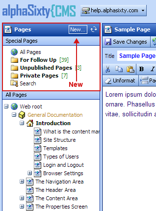 When the Pages Tab is active, a New... link appears in the tab heading. This link allows Administrators to create a new page.