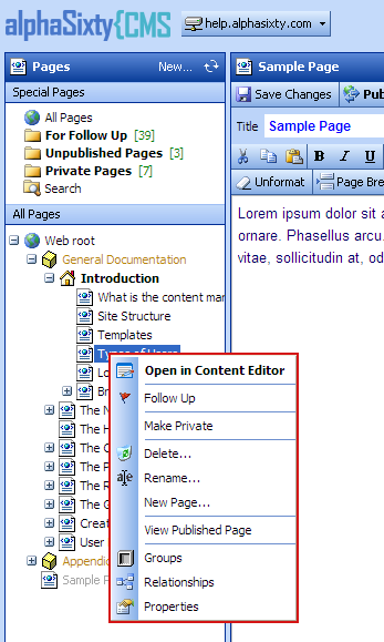 Right-clicking on a page in any of the views displays a context menu showing the actions allowed to be performed on that page.