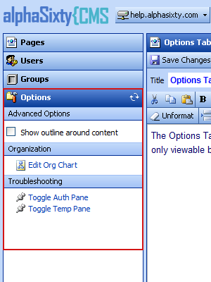 Show outline around content Checking this box causes the Content Manager to show an outline around the editable region in WYSIWYG view. This outline shows the exact dimensions the content will occupy on the website. See WYSIWYG & HTML Views for more information about the editable region. Edit Org Chart This launches the Org Chart editor, which allows you to manage a hierarchy of users and groups in your organization. This is mainly of use for intranets in which a company org chart is provided for employees. A custom template must be programmed in order to include the resulting org chart in the website. See Maintaining an Org Chart for more information about the Org Chart editor. Troubleshooting options are available only to Administrators.
